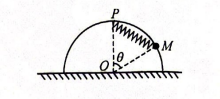 如图所示, 一半圆形光滑圆环固定在坚直平面内, $O$ 为圆心, $P$ 为圆环最高点. 中间有孔、质量为 $m$ 的小球穿在圆环上, 轻弹簧一端固定在 $P$ 点, 另一端与小球相连, 小球在 $M$ 点保持静止, $O M$ 与 $O P$ 夹角为 $\theta=60^{\circ}$. 已知重力加速度为 $g$, 则