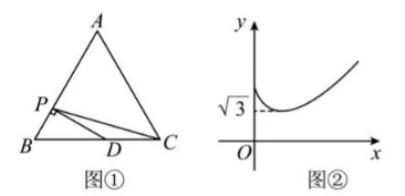 如图, 在等边 $\triangle A B C$ 中, 点 $D$ 是 $B C$ 边的三等分点, 连接 $P C, P D$ 设 $B P=x$, 图①中 $P D, P C$ 其中一条线段的长为 $y$. 运动过程中 $y$ 与 $x$ 函数关系的图象如图②所示, 则 $A D$ 长为
