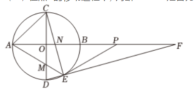 如图, $A B, C D$ 是 $\odot O$ 的两条直径, 且 $A B \perp C D$, 点 $E$ 是 $\overparen{B D}$ 上一动点 (不与点 $B, D$ 重合), 连接 $D E$ 并延长交 $A B$ 的延长线于点 $F$, 点 $P$ 在 $A F$ 上, 且 $\angle P E F=\angle D C E$, 连接 $A E, C E$ 分别交 $O D, O B$ 于点 $M, N$, 连接 $A C$, 设 $\odot O$ 的半径为 $r$.