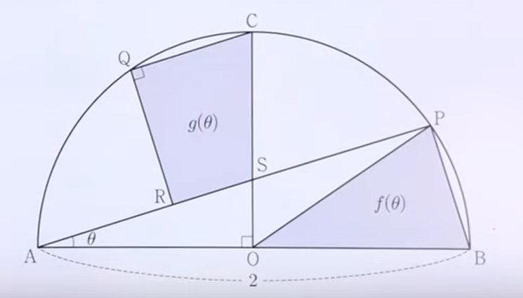 设$\mathrm{S}$ 为线段 $\mathrm{AP}$ 和线段 $\mathrm{CO}$ 的交点。 当$\angle \mathrm{PAB}=\theta$时,三角形$\mathrm{POB}$的面积为$f(\theta)$,矩形$\mathrm{CQRS}$的面积为$g(\theta)$。