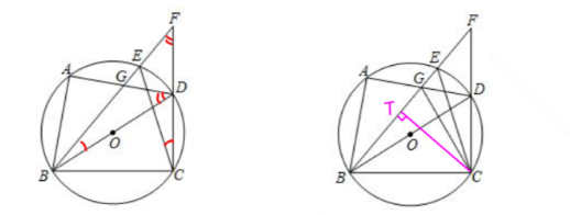 如图 1, 四边形 $A B C D$ 内接于以 $B D$ 为直径的 $\odot O, E$ 为 $\widehat{\mathrm{AD}}$ 上一点, 且 $\widehat{A E}=\widehat{\mathrm{CD}}$, 连结 $B E$ 并延长交 $C D$ 的延长线于点 $F, B E$ 与 $A D$ 交于点 $G$, 连接 $C E$.