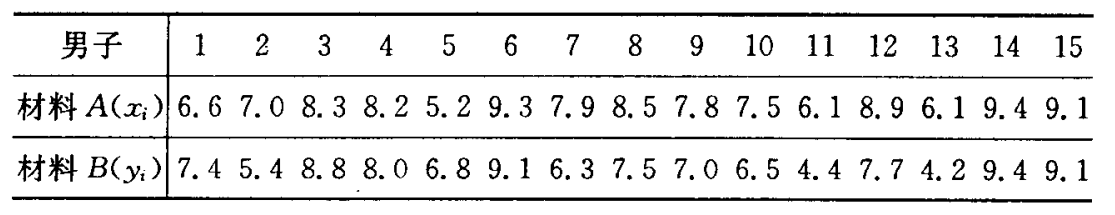 为了比较用来做鞋后跟的两种材料的质量,制作了 15 双皮鞋,每双鞋的一只用 $A$ 材料做后跟,另一只用 $B$ 材料做后跟,然后选取了 15 个生活条件各不相同的男子试穿这 15 双鞋。假设试穿开始时每只鞋后跟的高度均为 10 mm ,经过一个月以后再次测量各双鞋后跟的高度,得如下数据(见表9-4)。