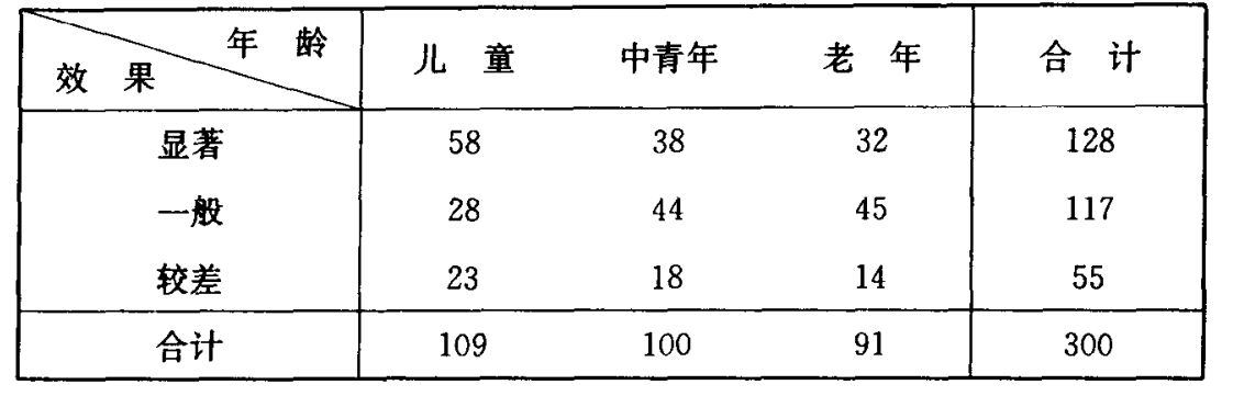 为了了解某种药品对某种疾病的疗效是否与患者的年龄有关,共抽查了 300 名患者.将疗效分为"显著","一般"和"较差"三个等级,将年龄分成"儿童","中青年"和"老年"三个等级,得到表 $9-10$所示的数据,在显著性水平 $\alpha=0.05$ 下,检验假设"疗效与患者年龄无关”