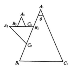 如图,已知给定线段 $B_1 C_1$ 长为 2 ,以 $B_1 C_1$ 为底边作顶角为 $\theta\left(0^{\circ} < \theta \leq 90^{\circ}\right)$ 的等腰三角形 $A_1 B_1 C_1$ ,取 $\triangle A_1 B_1 C_1$ 的腰 $A_1 B_1$ 的三等分点 $B_2, C_2\left(B_2\right.$ 靠近 $\left.A_1\right)$ ,以 $B_2 C_2$ 为底边向 $\triangle A_1 B_1 C_1$ 外部作顶角为 $\theta$ 的等腰三角形 $A_2 B_2 C_2 \cdots \cdots$ 依次类推,取 $\triangle A_{n-1} B_{n-1} C_{n-1}$ 的腰 $A_{n-1} B_{n-1}$ 的三等分点 $B_n, C_n\left(B_n\right.$ 靠近 $\left.A_{n-1}\right)$ ,以 $B_n C_n$ 为底边向 $\triangle A_{n-1} B_{n-1} C_{n-1}$ 外部作顶角为 $\theta$ 的等腰三角形 $A_n B_n C_n(n \geq 2)$ ,得到三角形列 $\left\{\triangle A_n B_n C_n\right\}$ .
