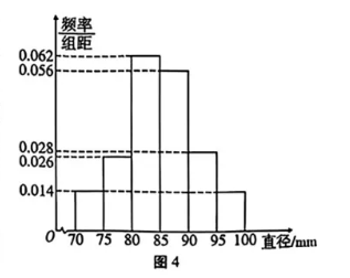 已知某种业公司培育了新品种的橙子,现从某批次收获的果实中随机抽取了 100 个橙子(直径位于 70 mm 至 100 mm 之间)作为样本,统计得到如图 4 所示的频率分布直方图.