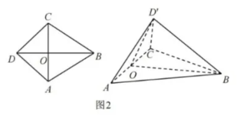 如图 2,平面四边形 $A B C D$ 满足 $A B=A C=B C=\sqrt{2} D C=\sqrt{2} D A=2, B D$ 与 $A C$ 交于点 $O$ ,若将 $\triangle A C D$沿 $A C$ 翻折,得到三棱锥 $D^{\prime}-A B C$ ,已知二面角 $D^{\prime}-A C-B$ 的平面角为 $\alpha$ ,直线 $A D^{\prime}$ 与平面 $A B C$ 所成的角为 $\beta, \angle D^{\prime} A C=\gamma$ ,则下列说法正确的是