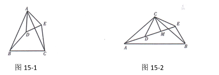 如图 15-1, 若 $\triangle A B C$ 和 $\triangle A D E$ 是顶角相等的等腰三角形, $B C, D E$ 分别是 底边. 求证: $B D=C E$;