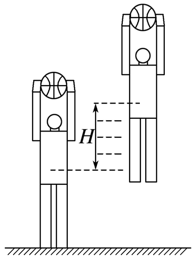 如图,篮球架下的运动员原地垂直起跳扣篮,离地后重心上升的最大高度为 $H$ .上升第一个 $\frac{H}{4}$ 所用的时间为 $t_1$ ,第四个 $\frac{H}{4}$ 所用的时间为 $t_2$ .不计空气阻力,则 $\frac{t_2}{t_1}$ 满足