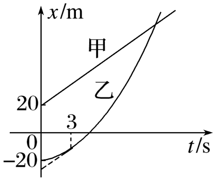 甲、乙两个质点沿同一直线运动,其中质点甲以3 m/s的速度做匀速直线运动,质点乙做初速度为零的匀变速直线运动,它们的位置x随时间t的变化如图所示.已知t=3 s时,甲、乙图线的斜率相等.下列判断正确的是