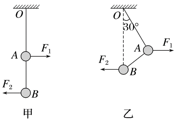 如图甲所示,$A, ~ B$ 两小球通过两根轻绳连接并悬挂于 $O$ 点,已知两轻绳 $O A$ 和 $A B$ 的长度之比为 $\sqrt{3}: 1$ ,$A$ , $B$ 两小球质量分别为 $2 m$ 和 $m$ ,现对 $A, ~ B$ 两小球分别施加水平向右的力 $F_1$和水平向左的力 $F_2$ ,两球恰好处于图乙的位置静止,此时 $B$ 球恰好在悬点 $O$ 的正下方,轻绳 $O A$ 与竖直方向成 $30^{\circ}$ 角,则
