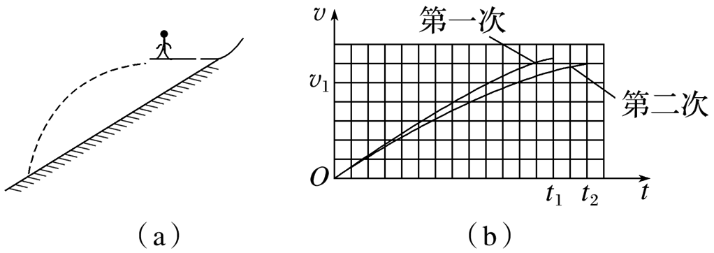 如图(a),在跳台滑雪比赛中,运动员在空中滑翔时身体的姿态会影响其下落的速度和滑翔的距离.某运动员先后两次从同一跳台起跳,每次都从离开跳台开始计时,用v表示他在竖直方向的速度,其v-t图像如图(b)所示,t1和t2是他落在倾斜雪道上的时刻.则