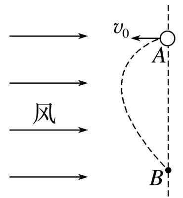 如图所示,在风洞实验室中,从A点以水平速度v0向左抛出一个质量为m的小球(可视为质点),小球抛出后所受空气作用力沿水平方向,其大小为F,经过一段时间小球运动到A点正下方的B点处,重力加速度为g,在此过程中,求: