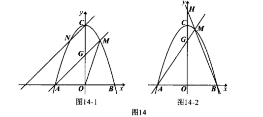 如图 14, 在平面直角坐标系中, 抛物线 $y=a x^2+c(a \neq 0)$ 与 $x$ 轴交于 $A, B$ 两点, 点 $B$ 的 坐标是 $(2,0)$, 顶点 $C$ 的坐标是 $(0,4), M$ 是抛物线上一动点, 且位于第一象限, 直线 $A M$ 与 $y$ 轴交于点 $G$.