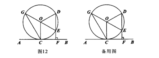 如图 12, $A B$ 为 $\odot O$ 的切线, $C$ 为切点, $D$ 是 $\odot O$ 上一点, 过点 $D$ 作 $D F \perp A B$, 垂足 为 $F, D F$ 交 $\odot O$ 于点 $E$, 连接 $E O$ 并延长交 $\odot O$ 于点 $G$, 连接 $C G, O C, O D$, 已知 $\angle D O E=2 \angle C G E$.