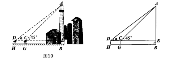 如图 $10, A B$ 是底部 $B$ 不可到达的一座建筑物, $A$ 为建筑物的最高点, 测角仪器的高 $D H=C G=1.5$ 米.某数学兴趣小组为测量建筑物 $A B$ 的高度, 先在 $H$ 处用测角仪器测得建筑物 顶端 $A$ 处的仰角 $\angle A D E$ 为 $\alpha$, 再向前走 5 米到达 $G$ 处, 又测得建筑物顶端 $A$ 处的仰角 $\angle A C E$ 为 $45^{\circ}$, 已知 $\tan \alpha=\frac{7}{9}, A B \perp B H, H, G, B$ 三点在同一水平线上, 求建筑物 $A B$ 的高度.