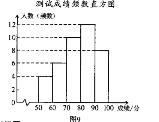 2022 年 3 月 28 日是第 27 个全国中小学生安全教育日. 某校为调查本校学生对安全知 识的了解情况, 从全校学生中随机抽取若干名学生进行测试, 测试后发现所有测试的学生 成绩均不低于 50 分:将全部测试成绩 $x$ (单位: 分) 进行整理后分为五组 $(50 \leqslant x < 60$, $60 \leqslant x < 70,70 \leqslant x < 80,80 \leqslant x < 90,90 \leqslant x \leqslant 100$ ), 并绘制成如下的频数直方图 (如图 9).