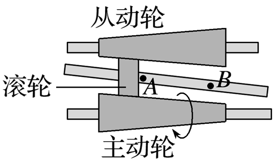 级变速箱是自动挡车型变速箱的一种,比普通的自动变速箱换挡更平顺,没有冲击感.如图为其原理图,通过改变滚轮位置实现在变速范围内任意连续变换速度.A、B为滚轮轴上两点,变速过程中主动轮转速不变,各轮间不打滑,则