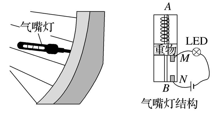 如图为自行车气嘴灯及其结构图,弹簧一端固定在A端,另一端拴接重物,当车轮高速旋转时,LED灯就会发光.下列说法正确的是