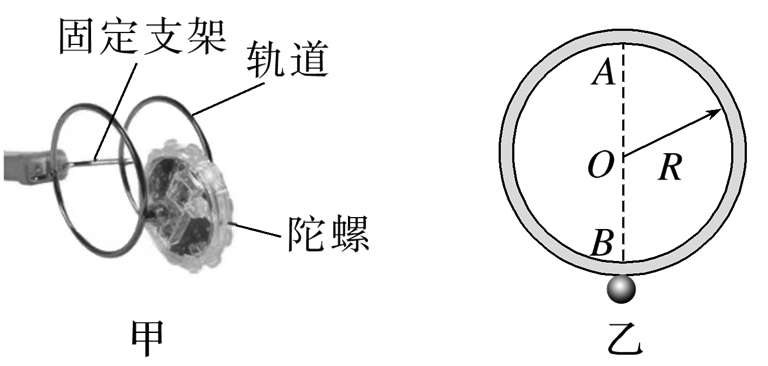 如图甲所示的陀螺可在圆轨道的外侧旋转而不脱落,好像轨道对它施加了魔法一样,被称为“魔力陀螺”,该玩具深受孩子们的喜爱.其物理原理可等效为如图乙所示的模型:半径为R的磁性圆轨道竖直固定,质量为m的小铁球(视为质点)在轨道外侧转动,A、B两点分别为轨道上的最高点、最低点.铁球受轨道的磁性引力始终指向圆心且大小不变,重力加速度为g,不计摩擦和空气阻力.