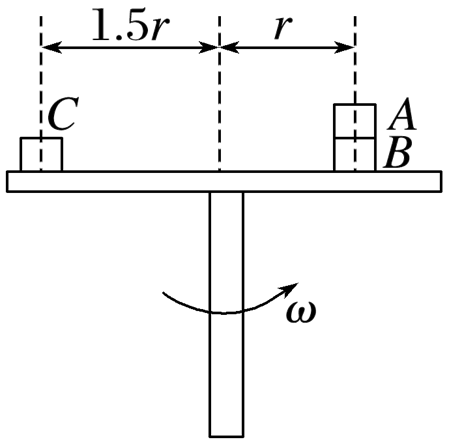 如图所示,叠放在水平转台上的物体 $A, ~ B$ 及物体 $C$ 能随转台一起以角速度 $\omega$ 匀速转动,$A, ~ B, ~ C$ 的质量分别为 $3 m, ~ 2 m, ~ m, ~ A$ 与 $B, ~ B$ 和 $C$ 与转台间的动摩擦因数都为 $\mu, ~ A$ 和 $B, ~ C$离转台中心的距离分别为 $r$ 和 $1.5 r$ 最大静摩擦力等于滑动摩擦力,物体 $A$ ,