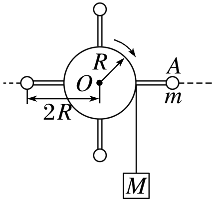 如图所示,鼓形轮的半径为R,可绕固定的光滑水平轴O转动.在轮上沿相互垂直的直径方向固定四根直杆,杆上分别固定有质量为m的小球,球与O的距离均为2R.在轮上绕有长绳,绳上悬挂着质量为M的重物.重物由静止下落,带动鼓形轮转动.重物落地后鼓形轮匀速转动,转动的角速度为ω.绳与轮之间无相对滑动,忽略