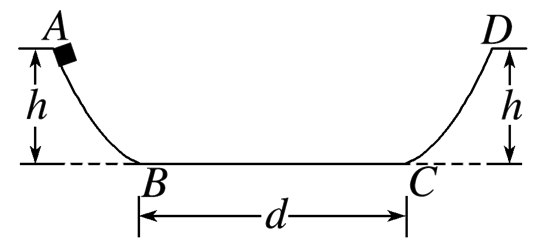 如图所示,ABCD是一个盆式容器,盆内侧壁与盆底BC的连接处都是一段与BC相切的圆弧,BC水平,其长度d=0.50 m,盆边缘的高度为h=0.30 m.在A处放一个质量为m的小物块并让其由静止下滑.已知盆内侧壁是光滑的,而盆底BC面与小物块间的动摩擦因数为μ=0.1.小物块在盆内来回滑动,最后停下来,则停止的地点到B的距离为
