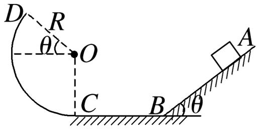 如图所示,倾角为θ=37°的足够长光滑固定斜面AB与长LBC=2 m的粗糙水平面BC用一小段光滑圆弧(长度不计,未画出)平滑连接,半径R=1.5 m的光滑圆弧轨道CD与水平面相切于C点,OD与水平方向的夹角也为θ=37°.质量为m的小滑块从斜面上距B点L0=2 m的位置由静止开始下滑,恰好运动到C点.已知重力加速度g=10 m/s2,sin 37°=0.6,cos 37°=0.8.