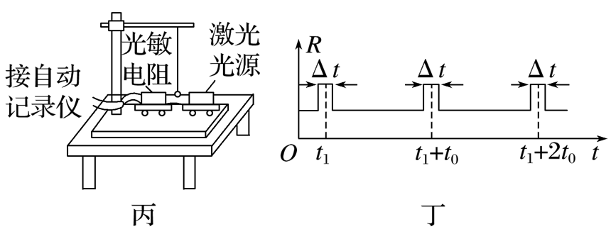 (2)(2)实验时,若摆球在垂直纸面的平面内摆动,为了将人工记录振动次数改为自动记录振动次数,在摆球运动的最低点的左、右两侧分别放置一激光光源与光敏电阻,如图丙所示.光敏电阻与某一自动记录仪相连,该仪器显示的光敏电阻阻值R随时间t的变化图像如图丁所示,则该单摆的振动周期为 ________ .若保持悬点到摆球顶点的绳长不变,改用直径是原摆球直径2倍的另一摆球进行实验,则该单摆的周期将 ________ (选填“变大”“不变”或“变小”),图丁中的Δt将 ________ (选填“变大”“不变”或“变小”).
