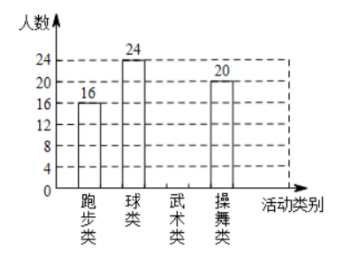 民海中学开展以 “我最喜欢的健身活动” 为主题的调查活动, 围绕 “在跑步类、球类、武术类、操舞 类四类健身活动中, 你最喜欢哪一类? (必选且只选一类)” 的问题, 在全校范围内随机抽取部分学生进 行问卷调查, 将调查结果整理后绘制成如图所示的不完整的条形统计图, 其中最喜欢操舞类的学生人数占 所调查人数的 $25 \%$. 请你根据图中提供的信息解答下列问题:
