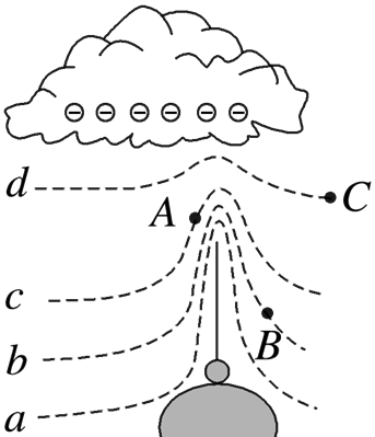 如图所示,雷雨天带有负电的乌云飘过一栋建筑物上空时,在避雷针周围形成电场,电场的等差等势面a、b、c、d分布情况如图所示,在等势面中有A、B、C三点.下列说法中正确的是