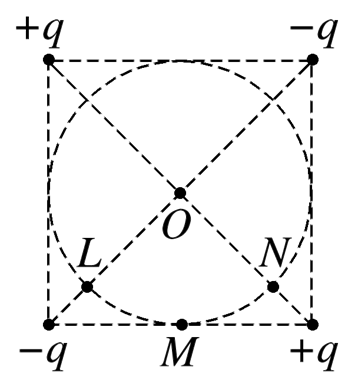如图,两对等量异号点电荷+q、-q(q>0)固定于正方形的4个顶点上.L、N是该正方形两条对角线与其内切圆的交点,O为内切圆的圆心,M为切点.则