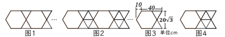 观察发现:自左向右拼接图 1 时,每增加一个图 3 所示的拼接单元,则增加 1 个正六边形和 2个正三角形,长度增加 40 cm ,从而 x 个这样的拼接单元拼成一行的长度为 $(40 x +10) cm$ .自左向右拼接图2时,每增加一个图4所示的拼接单元,则增加 $\qquad$ (1)个正六边形和 $\qquad$ (2)个正三角形,长度增加 $\qquad$ (3) cm ,从而 y 个这样的拼接单元拼成一行的长度为 $\qquad$ (4) cm .