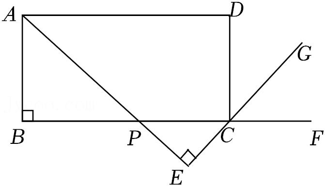 如图, 在矩形 $\mathrm{ABCD}$ 中, $\mathrm{AB}=\frac{1}{2} \mathrm{BC}$, 点 $\mathrm{F}$ 在 $\mathrm{BC}$ 边的延 长线上, 点 $\mathrm{P}$ 是线段 $\mathrm{BC}$ 上一点 (与点 $\mathrm{B}, \mathrm{C}$ 不重合), 连接 $\mathrm{AP}$ 并延长, 过点 $\mathrm{C}$ 作 $\mathrm{CG} \perp \mathrm{AP}$, 垂足为 $\mathrm{E}$.