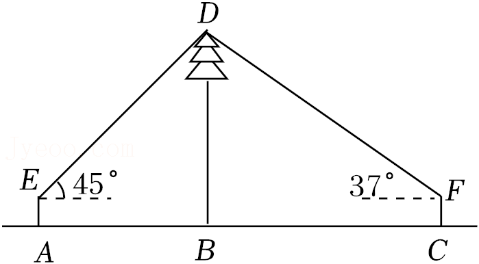 某班同学在一次综合实践课上, 测量校园内一棵树的高 度. 如图, 测量仪在 $\mathrm{A}$ 处测得树顶 $\mathrm{D}$ 的仰角为 $45^{\circ}, \mathrm{C}$ 处测得树 顶 $\mathrm{D}$ 的仰角为 $37^{\circ}$ (点 $\mathrm{A}, \mathrm{B}, \mathrm{C}$ 在一条水平直线上), 已知测量 仪高度 $\mathrm{AE}=\mathrm{CF}=1.6$ 米, $\mathrm{AC}=28$ 米, 求树 $\mathrm{BD}$ 的高度 (结果保留 小数点后一位. 参考数据: $\sin 37^{\circ} \approx 0.60, \cos 37^{\circ} \approx 0.80, \tan 37^{\circ} \approx 0.75$