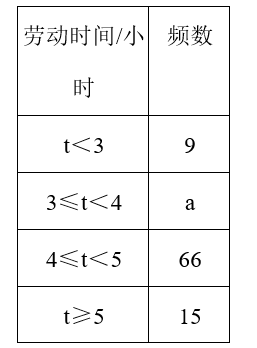 教育部在《大中小学劳动教育指导纲要(试行)》中明确要求:初中生每周课外生活和家庭生活中,劳动时间不少于3小时.某走读制初级中学为了解学生劳动时间的情况,对学生进行了随机抽样调查,并将调查结果制成不完整的统计图表,如图: