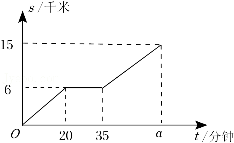 周末时, 达瓦在体育公园骑自行车锻炼身体, 他匀速骑 行了一段时间后停车休息, 之后继续以原来的速度骑行. 路程 $\mathrm{s}$ (单位: 千米) 与时间 $\mathrm{t}$ (单位: 分钟) 的关系如图所示, 则图中 的 $a=$