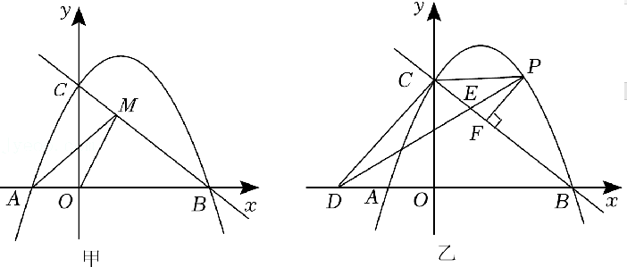 (2) 如图甲, 点 $\mathrm{M}$ 是直线 $\mathrm{BC}$ 上的一个动点, 连接 $\mathrm{AM}, \mathrm{OM}$, 是否存在点 $\mathrm{M}$ 使 $\mathrm{AM}+\mathrm{OM}$ 最小, 若存在, 请求出点 $\mathrm{M}$ 的坐标, 若 不存在, 请说明理由;
