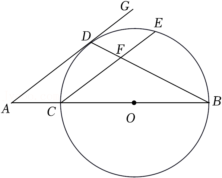 如图, 已知 $B C$ 为 $\odot O$ 的直径, 点 $D$ 为 $\widehat{C E}$ 的中点, 过点 $D$ 作 $\mathrm{DG} / / \mathrm{CE}$, 交 $\mathrm{BC}$ 的延长线于点 $\mathrm{A}$, 连接 $\mathrm{BD}$, 交 $\mathrm{CE}$ 于点 $\mathrm{F}$.