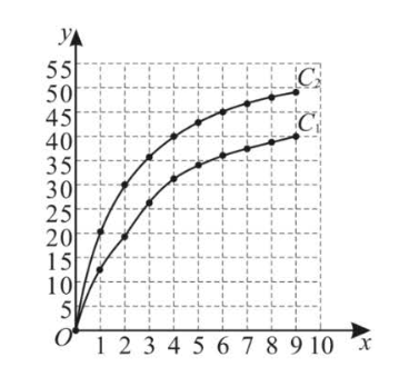 (1)观察曲线 $C_1$ ,当整数 $x$ 的值为 $\_\_\_\_$时,$y$ 的值首次超过 35;