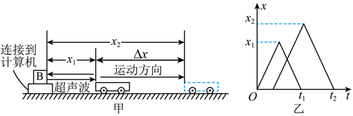 如图甲所示是一种速度传感器的工作原理图,在这个系统中B为一个能发射超声波的固定小盒子,工作时小盒子B向匀速直线运动的被测物体发出短暂的超声波脉冲,超声波速度为v_0,脉冲被运动的物体反射后又被小盒子B接收,从小盒子B发射超声波开始计时,经Δt_0时间再次发射超声波脉冲,图乙是连续两次发射的超声波的位移—时间图像。则下列说法正确的是