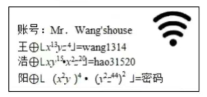 如图, 王老师把家里的 WIFI 密码设置成了数学问题. 吴同学来王老师家做客, 看到 $W I F I$ 图片, 思索了一会儿, 输入密码, 顺利地连接到了王老师家里的网络, 那么她输入 的密码是
