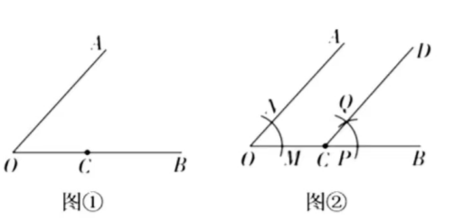 数学课上, 老师提出一个问题: 经过已知角一边上的点, 做一个角等于已知角. 如图, 用尺规过 $A O B$ 的边 $O B$ 上一点 $C$ (图①) 作 $D C B A O B$ (图②). 我们可以通过以下步骤