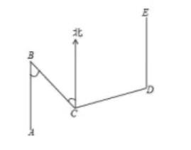 如图, 小亮从 $A$ 到达 $E$, 路线为 $A \rightarrow B \rightarrow C \rightarrow D \rightarrow E$. 由 $A$ 到 $B$ 和由 $D$ 到 $E$ 都是正北方向, 中间经历了 3 次拐弯, 第一次拐弯后, 行进方向变为南偏东 $40^{\circ}$, 若 $\angle D=105^{\circ}$, 则 $\angle B C D$ 的度数为