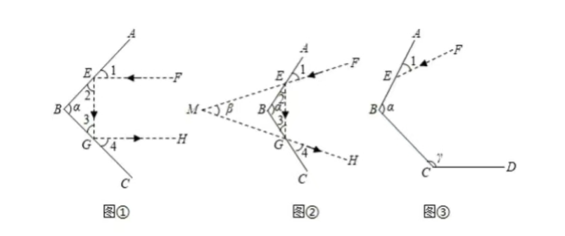(2) 如图②, 若 $\alpha=115^{\circ}$, 入射光线 $E F$ 与反射光线 $G H$ 的夹角 $\angle F M H=\beta$. 求 $\beta$ 的度数;