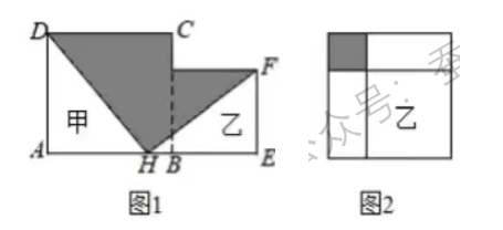 现有甲、乙两个正方形纸片, 将甲、乙并列放置后得到图 1, 已知点 $H$ 为 $A E$ 的中点, 连结 $D H, F H$. 将乙纸片放到甲的内部得到图 2. 已知甲、乙两个正方形边长之和为 6, 图 2 的阴影部分面积为 2 , 则图 1 的阴影部分面积为