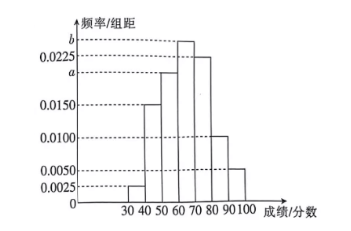 某校近期举行了 “2022 年新闻时事知识竞赛”, 现在随机抽查参赛的 200 名学生的得分 (满 分 100 分), 按照 $[30,40),[40,50),[50,60),[60,70),[70,80),[80,90),[90,100]$ 制作成如 图所示的频率分布直方图, 已知 $0.015, a, b$ 成等差数列.