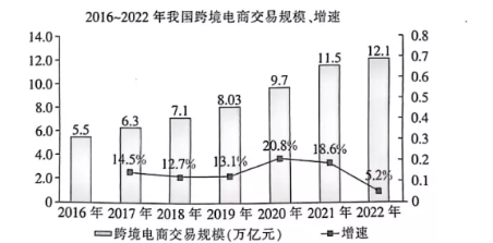 下图是我国跨境电商在 2016-2022 年的交易规模与增速表, 由图可以知道下列结论正确的是