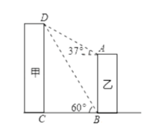 米, 在乙楼顶部 $A$ 点测得甲楼顶部 $D$ 点的仰角为 $37^{\circ}$, 在乙楼 底部 $B$ 点测得甲楼顶部 $D$ 点的仰角为 $60^{\circ}$, 则甲、乙两楼的高 度为多少? (结果精确到 1 米, $\sin 37^{\circ} \approx 0.60, \cos 37^{\circ} \approx 0.80$, $\tan 37^{\circ} \approx 0.75, \sqrt{3} \approx 1.73$ )