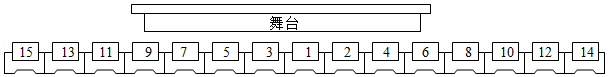 如图是某剧场第一排座位分布图. 甲、乙、丙、丁四人购票, 所购票数分别为 $2,3,4,5$. 每 人选座购票时, 只购买第一排的座位相邻的票, 同时使自己所选的座位号之和最小, 如 果按 “甲、乙、丙、丁”的先后顺序购票, 那么甲购买 1,2 号座位的票, 乙购买 3,5 , 7 号座位的票, 丙选座购票后, 丁无法购买到第一排座位的票. 若丙第一个购票, 要使其 他三人都能购买到第一排座位的票, 写出一种满足条件的购票的先后顺序