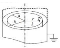 如图所示, 一半径为 $a$ 的 “无限长” 圆柱面上均匀带电, 其电荷线密度为 $\lambda$. 在它外面同轴地套一半径为 $b$ 的薄金属圆笥, 圆筒原先不带电, 但与地连接. 设地的电势为零, 则在内圆柱面里面、距离轴线为 $r$ 的 $P$ 点的场强大小和电势分别为: